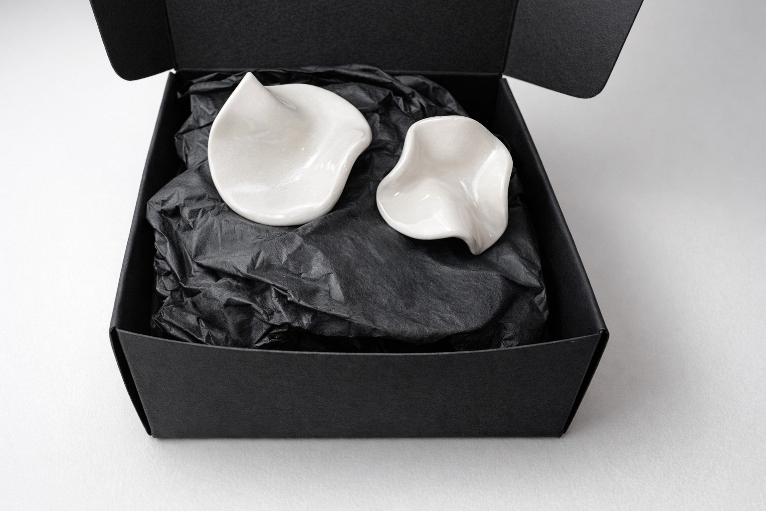 Las formas fluidas, suaves e irregulares evocan el movimiento natural de la materia, como si la porcelana se hubiera detenido en pleno pliegue. El acabado blanco, luminoso y sereno, potencia la pureza del volumen y su diálogo con la luz.