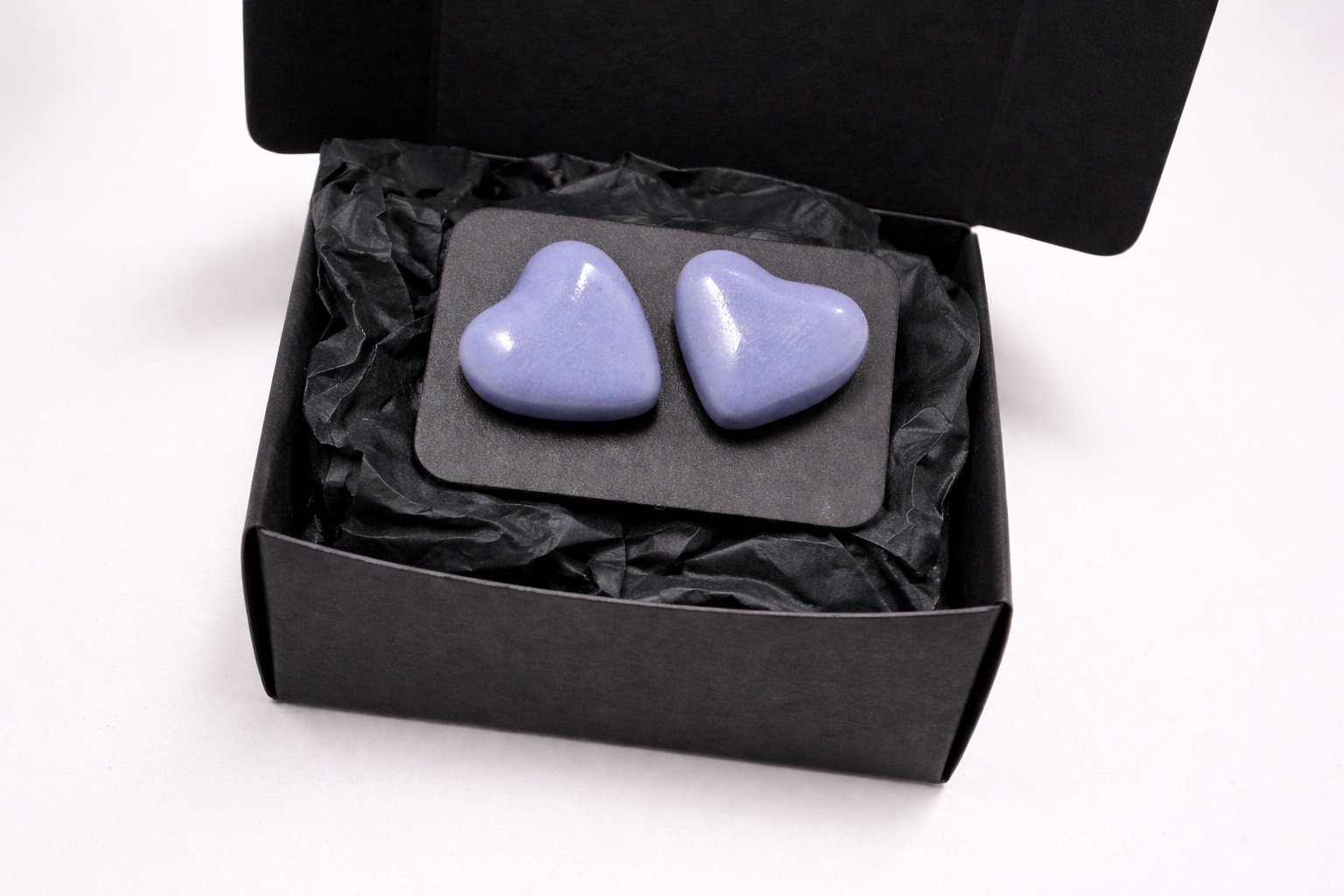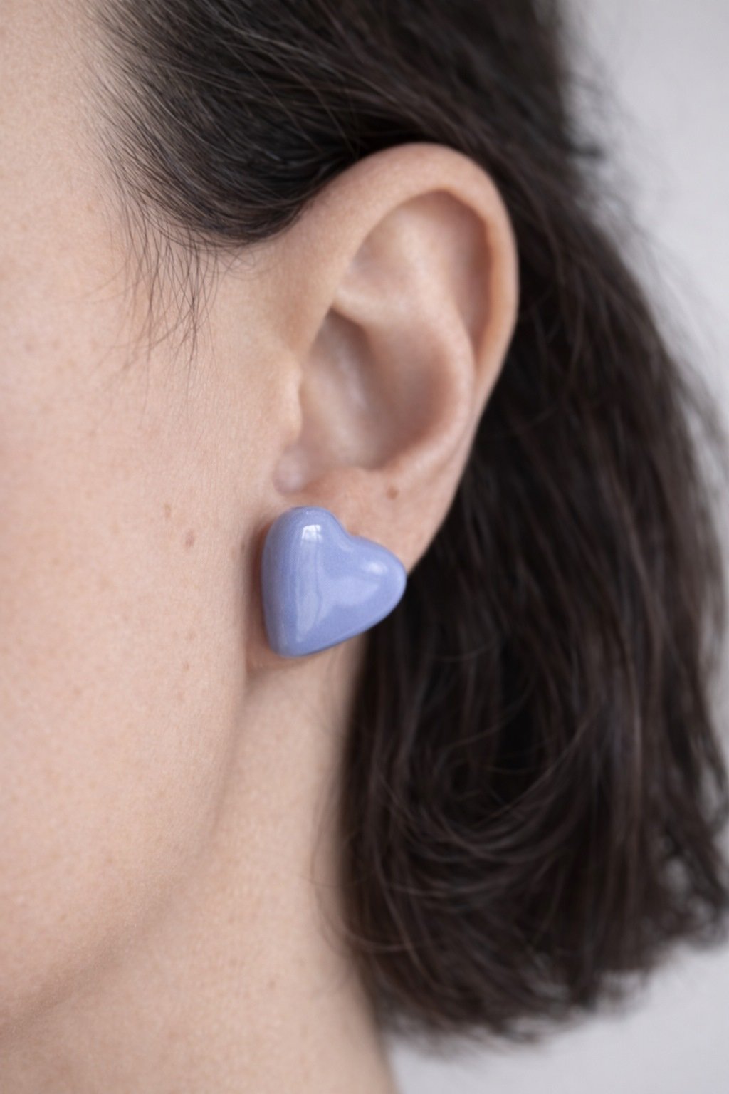 Hechos a mano en cerámica, cada pendiente presenta ligeras irregularidades que revelan su proceso artesanal. El esmalte lila, sereno y luminoso, crea una superficie brillante que refleja la luz con sutileza y aporta un carácter delicado y elegante.