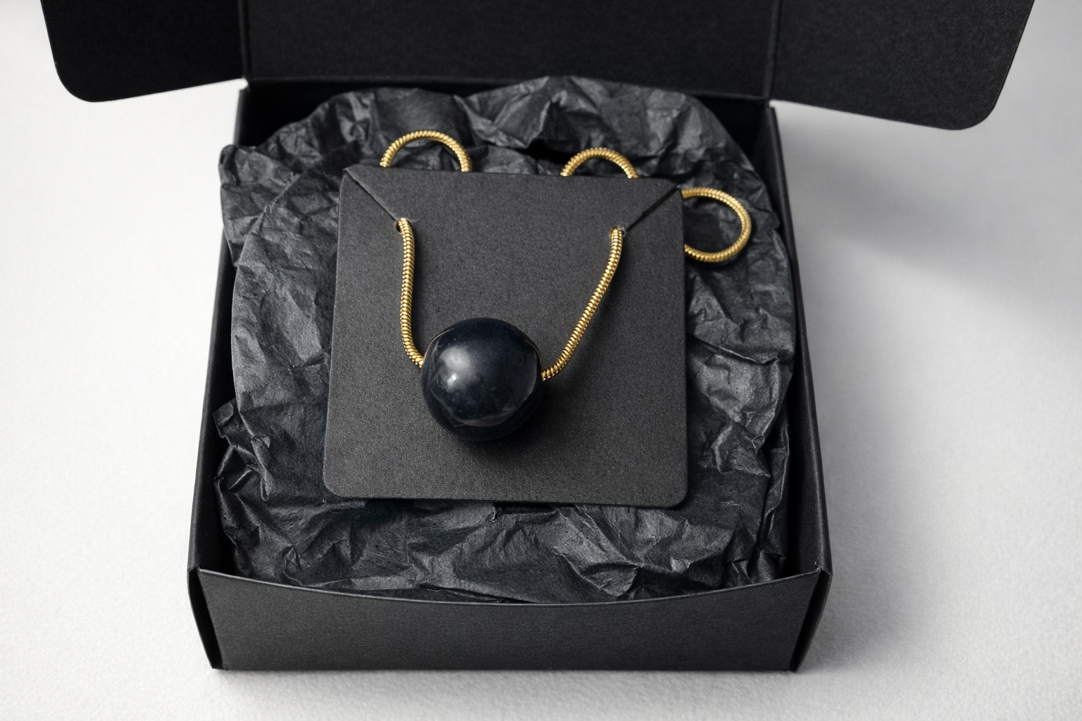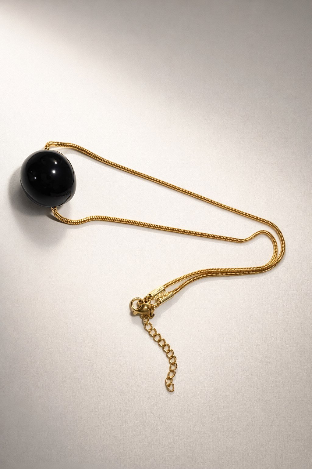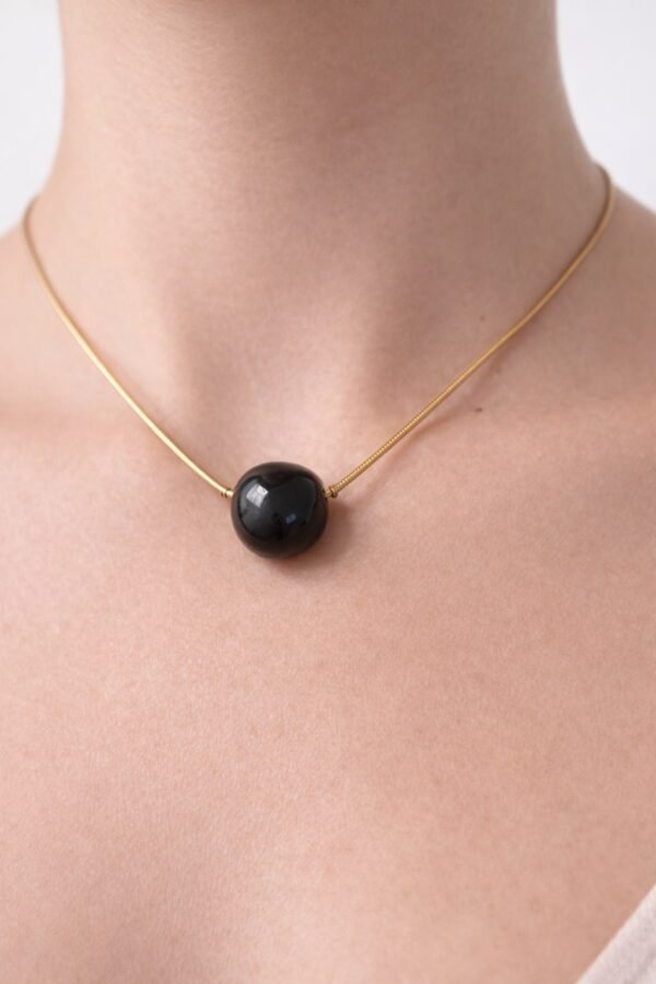 Hecho a mano en cerámica, cada collar es único. La superficie lisa y pulida refleja la luz con suavidad, mientras que las ligeras variaciones del esmalte revelan el proceso artesanal y dotan a cada pieza de carácter propio. La esfera, suspendida de una cadena fina, mantiene un diálogo limpio entre forma, materia y espacio.