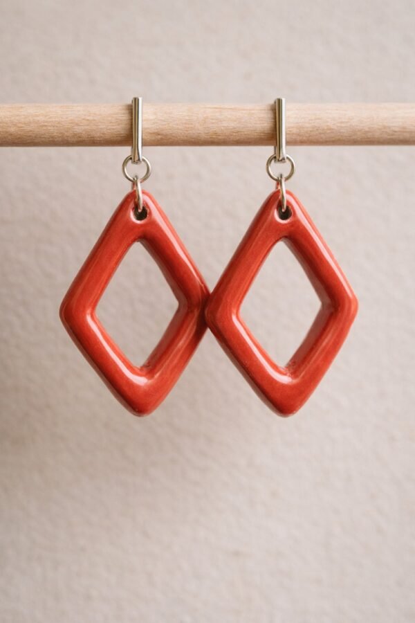 Hechos a mano en cerámica, cada pendiente presenta una silueta geométrica abierta, de líneas definidas pero ligeramente irregulares, que revelan el gesto humano del proceso. El rojo intenso de la pieza, profundo y vibrante, se obtiene durante la cocción, dando lugar a un acabado esmaltado lleno de matices y sutiles variaciones.