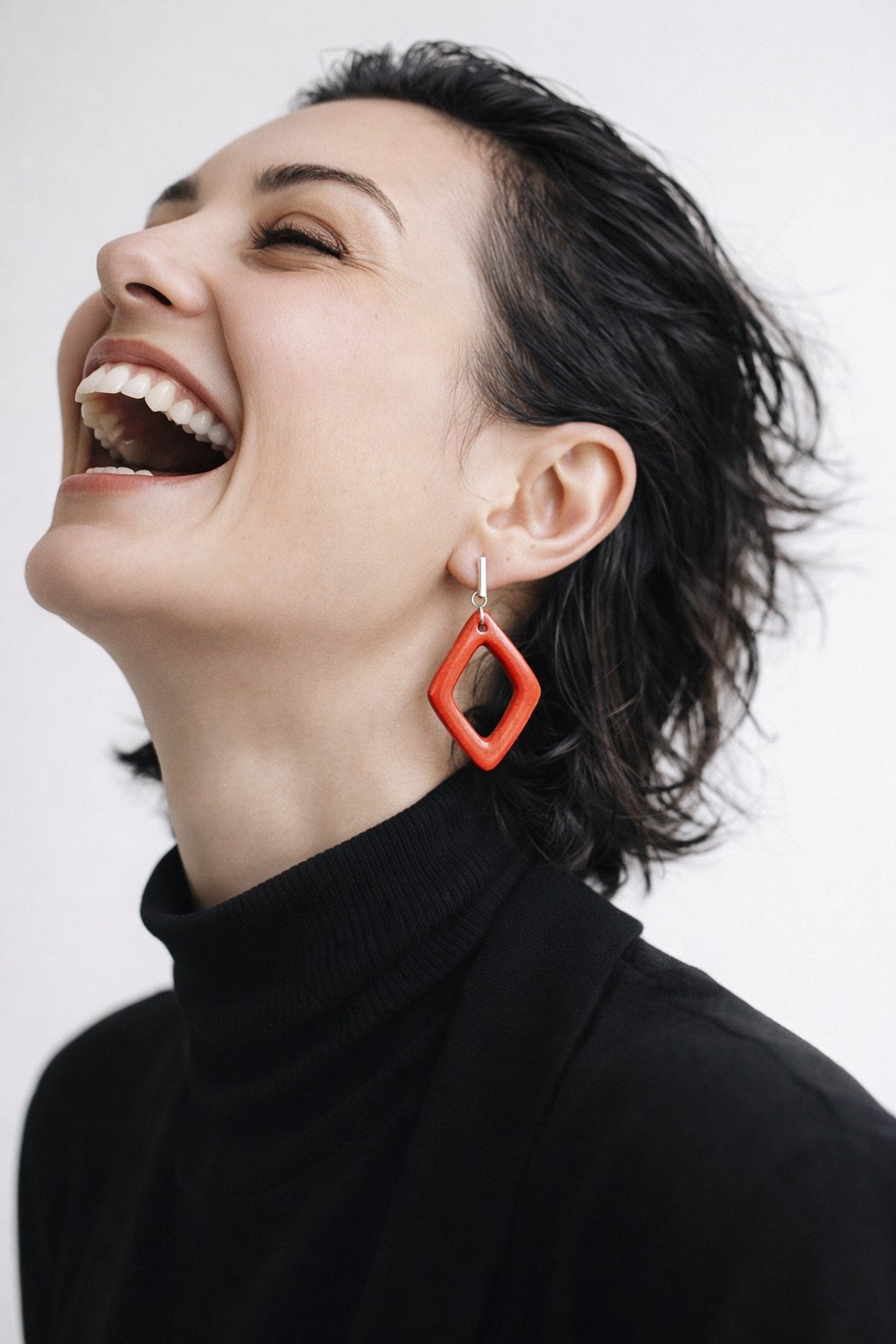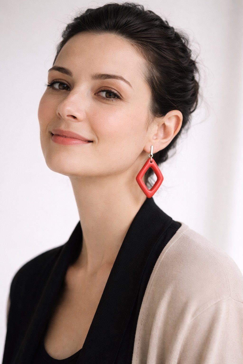 Envíos a España. Coste según destinoInspirados en la fuerza del color y en la geometría esencial, los pendientes Asteria Rombo Rojo nacen del diálogo entre la cerámica artesanal y la forma pura.
