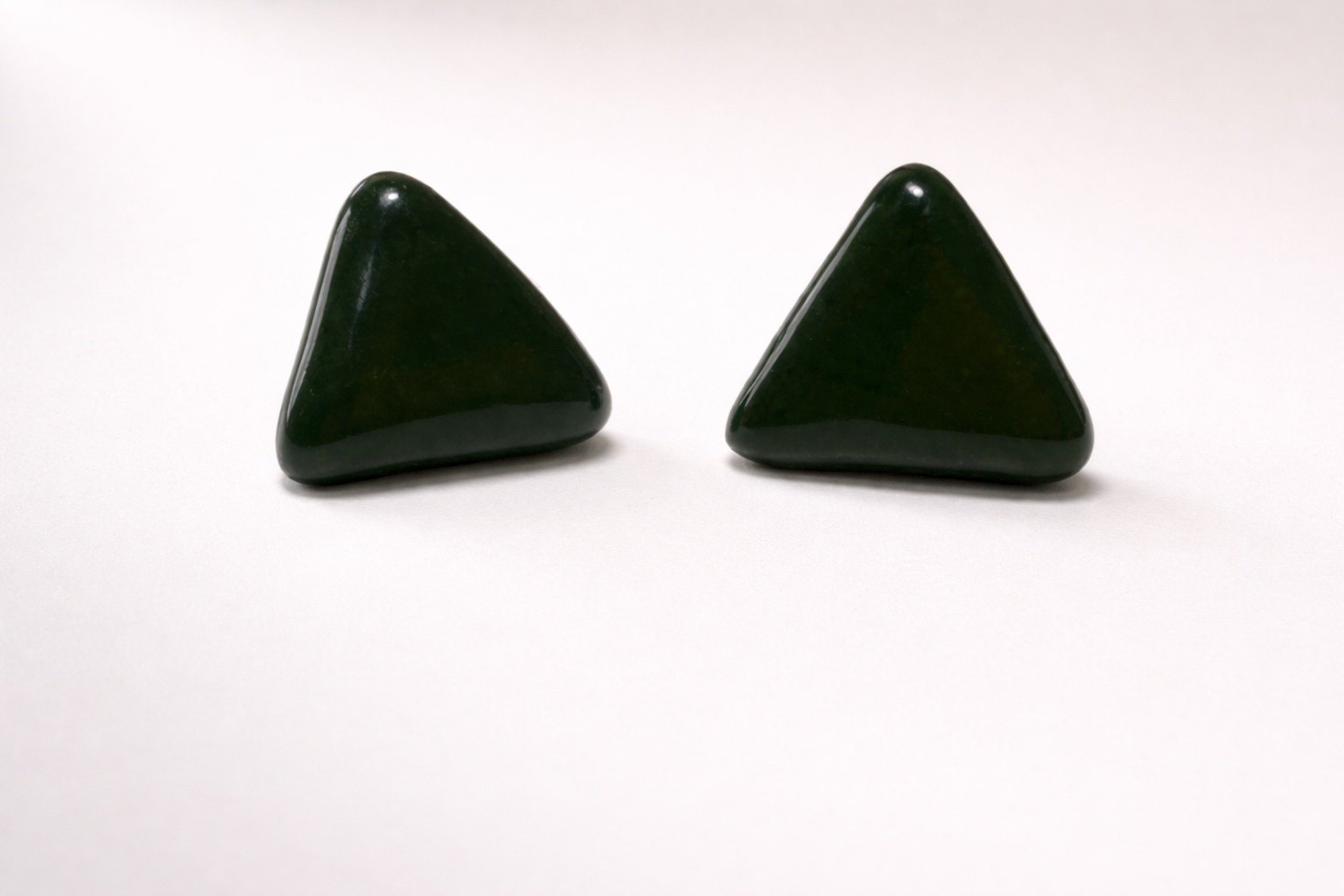 Hechos a mano en cerámica, cada pendiente presenta ligeras variaciones que revelan su proceso artesanal. Disponibles en dos colores, verde profundo y teja, el esmalte aplicado de forma manual crea una superficie brillante y envolvente que refleja la luz con suavidad y aporta profundidad al tono elegido.
