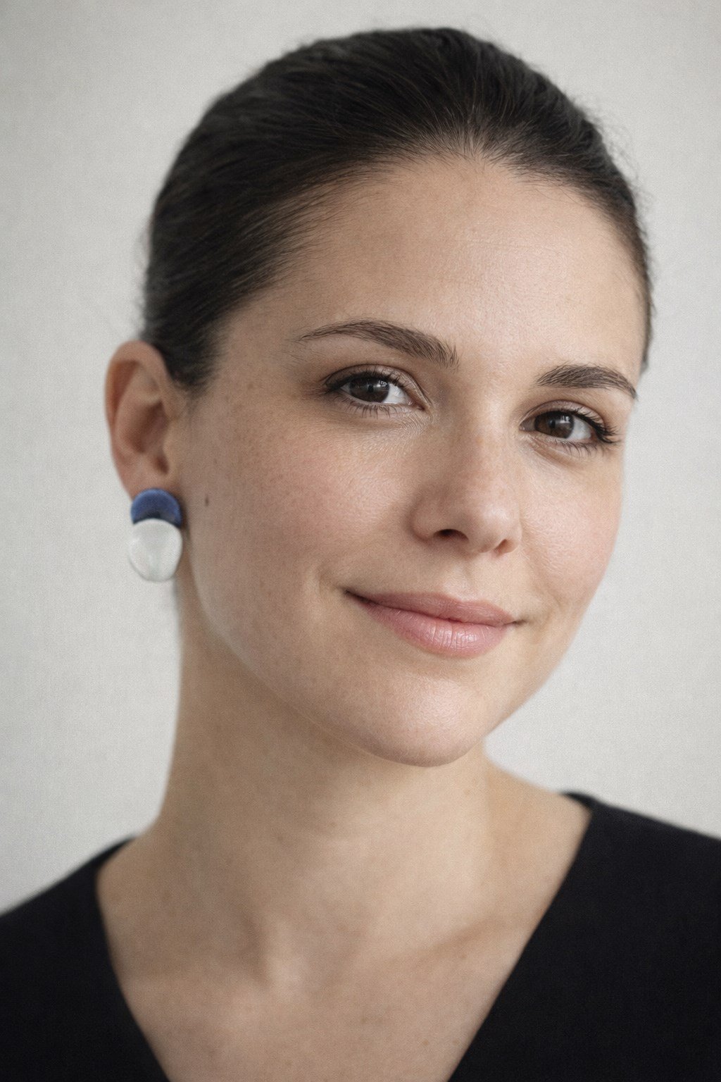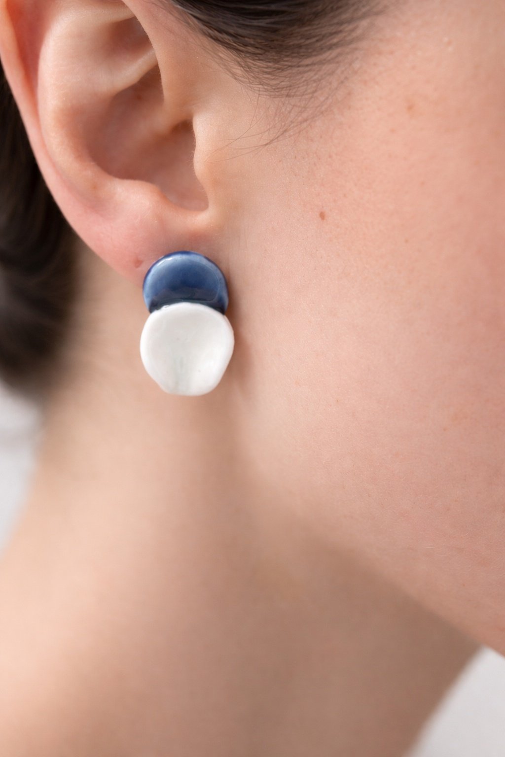 Pendientes de porcelana de estética minimalista y presencia escultórica. La composición combina un volumen redondo en azul profundo con una forma orgánica en blanco marfil, creando un contraste sereno y contemporáneo.