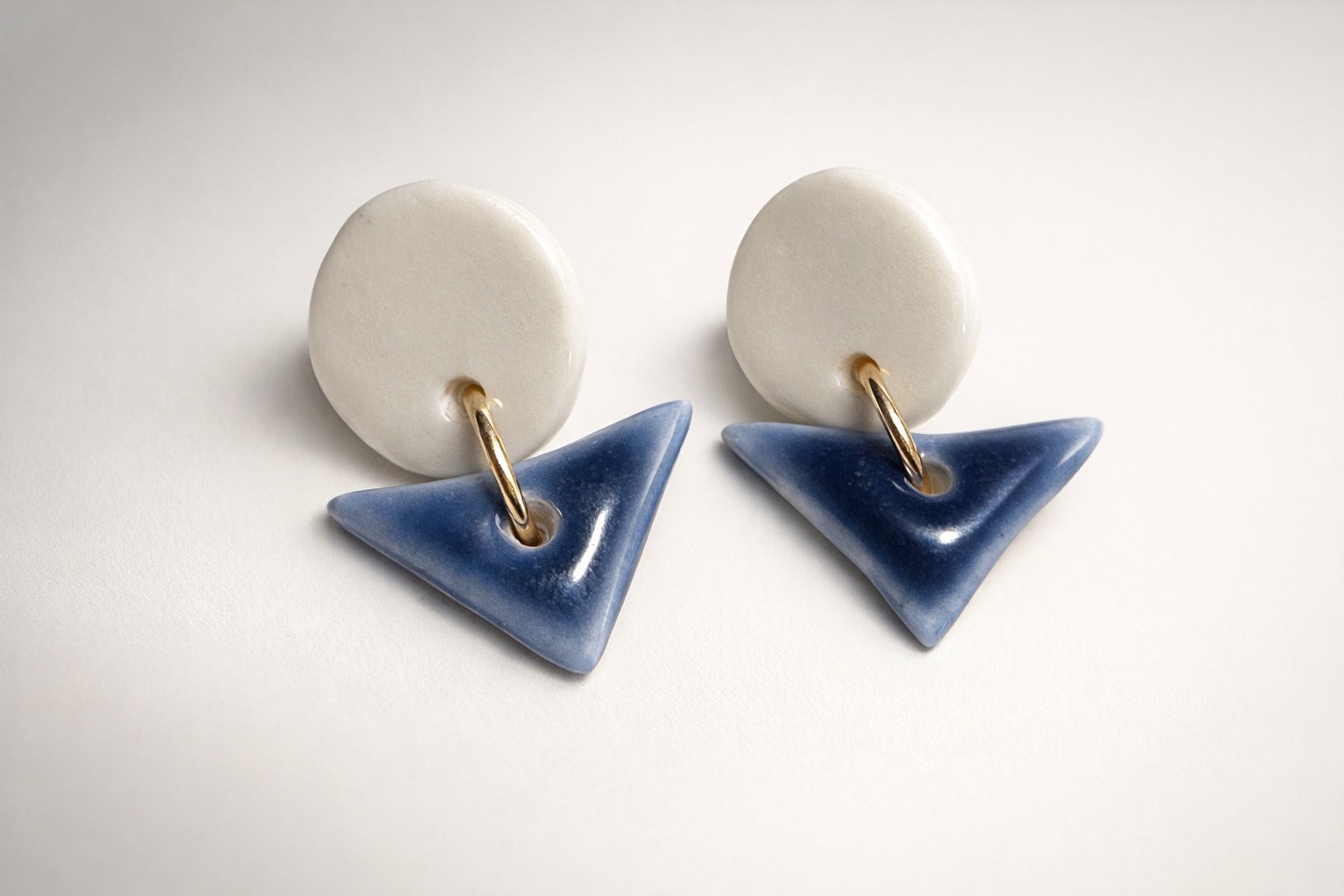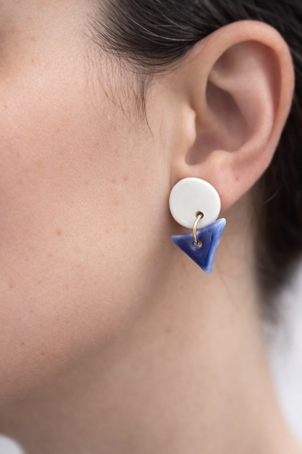 Envíos a España. Coste según destinoPendientes de porcelana que combinan geometría y suavidad en un diseño contemporáneo y equilibrado. La composición une un volumen circular en blanco marfil con una pieza triangular en azul profundo, creando un contraste sereno y sofisticado.