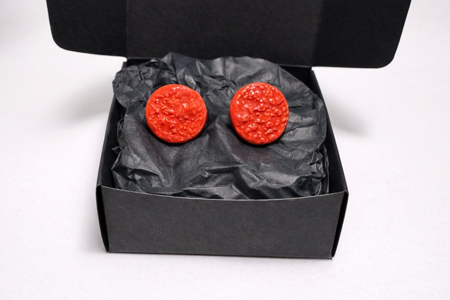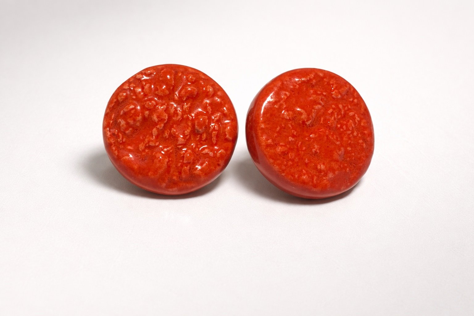 Hechos a mano en cerámica, cada pendiente es único. El esmalte crea una piel irregular y brillante, con pequeñas variaciones que atrapan la luz y revelan la riqueza del proceso artesanal. Disponibles en tonos intensos, como el rojo, y empolvados, como el rosa, el color se convierte en protagonista sin perder sutileza.
