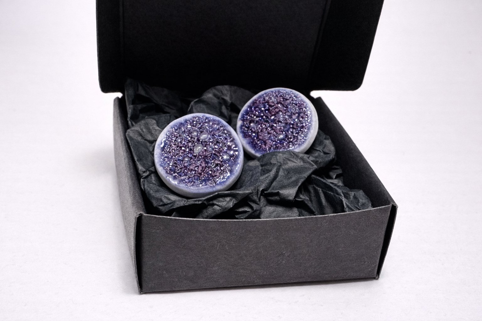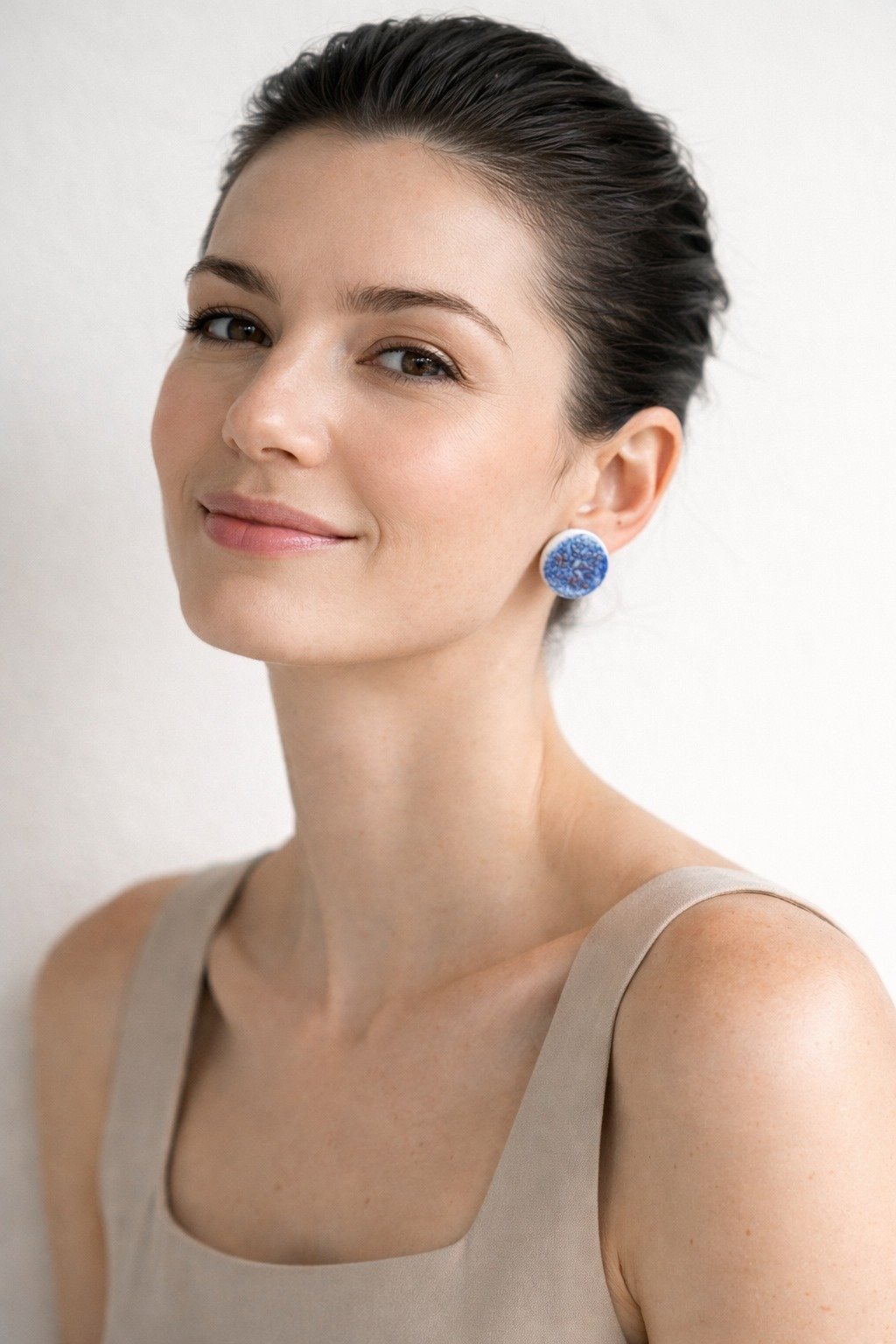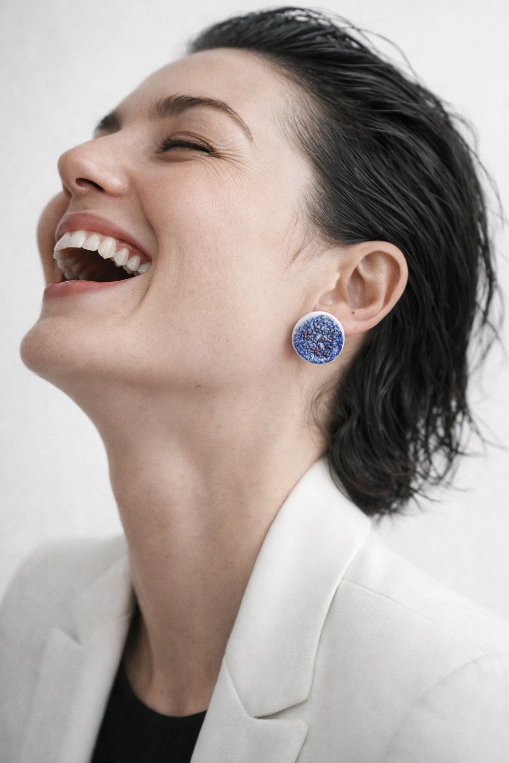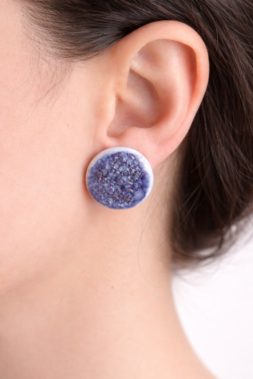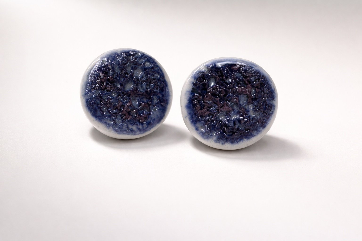 Hechos a mano en cerámica, cada pendiente es único. Las sutiles irregularidades del contorno y la profundidad del esmalte revelan el proceso artesanal, poniendo en valor el gesto humano detrás de la pieza. El azul intenso, con matices orgánicos y textura cristalina, crea una superficie vibrante que atrapa la luz de forma delicada y aporta carácter sin perder sobriedad.