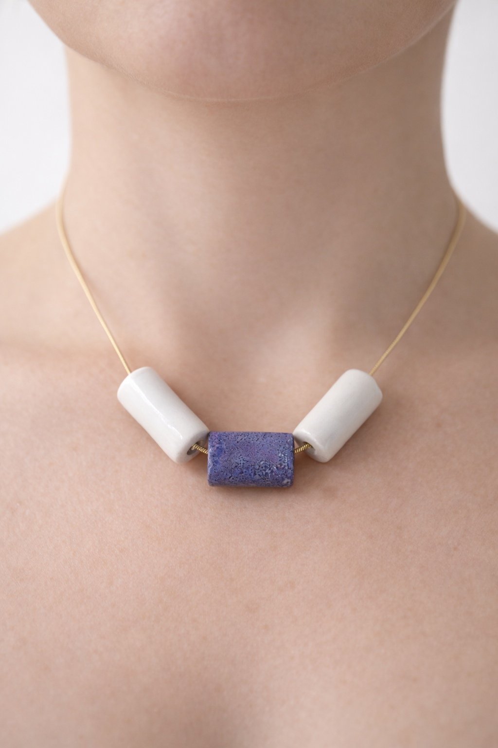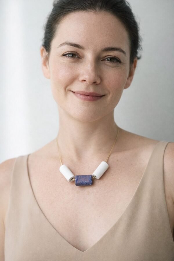 Envíos a España. Coste según destinoEste collar Lunaria · Destia se articula a partir de una composición serena y simbólica. En el centro, una pieza cerámica rectangular en tono azul profundo actúa como núcleo visual, flanqueada por dos cilindros blancos de acabado suave que aportan calma y luminosidad al conjunto.