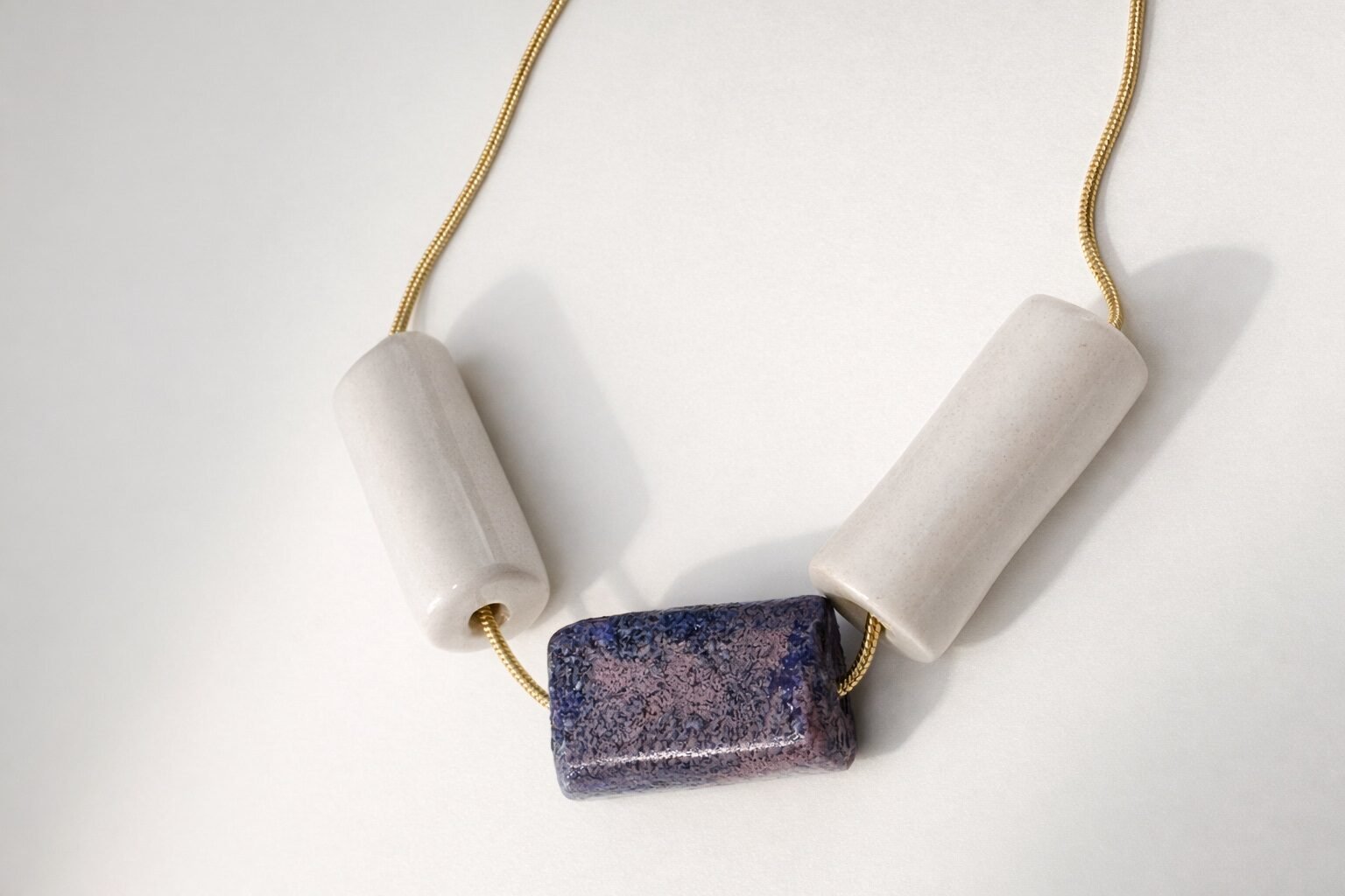 Las piezas se enlazan mediante una cadena metálica fina que permite que el collar repose con naturalidad sobre el cuello, manteniendo una presencia equilibrada y elegante. Realizado a mano en cerámica, cada ejemplar es único, con pequeñas variaciones que forman parte de su identidad artesanal.