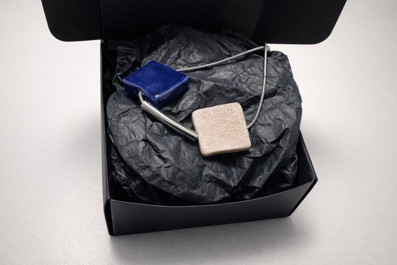 Hecho a mano, cada collar es único, con ligeras variaciones que forman parte de su naturaleza artesanal. Diseñado para descansar con naturalidad sobre el cuello, es una pieza de presencia silenciosa y atemporal, pensada para quienes encuentran belleza en la materia, el contraste y el equilibrio esencial.