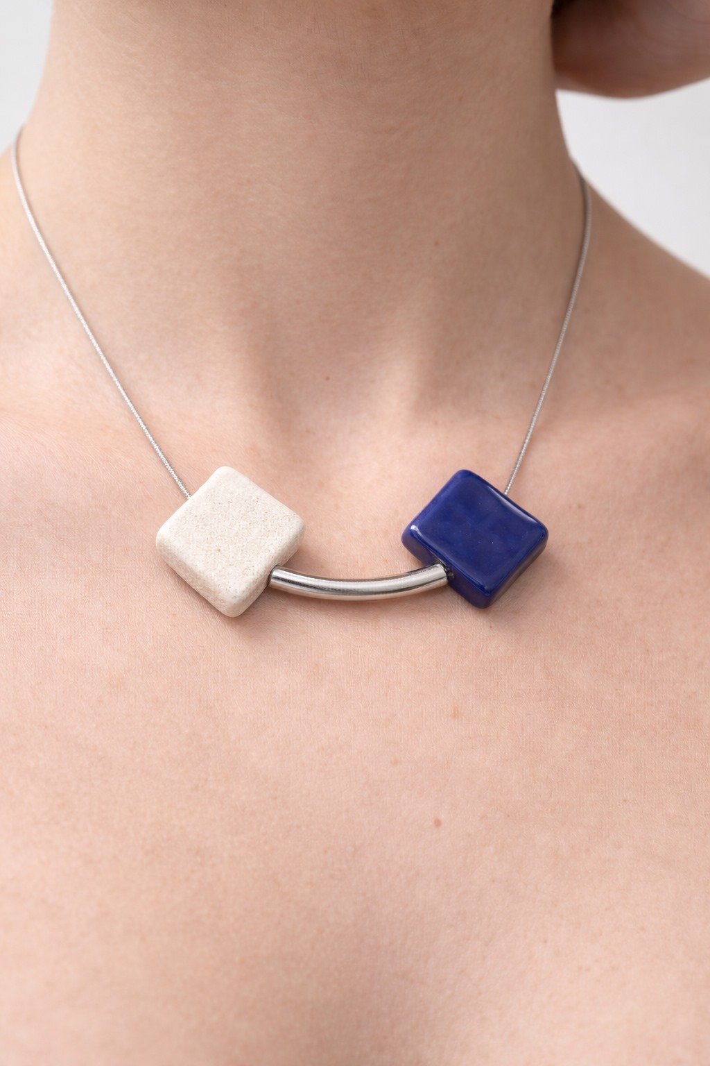 Envíos a España. Coste según destinoDe carácter sereno y composición equilibrada, este collar Lunaria Dual Azul explora el encuentro entre dos materias opuestas. Dos volúmenes cerámicos de forma geométrica dialogan a través de un arco de acero inoxidable que actúa como nexo y punto de tensión visual.