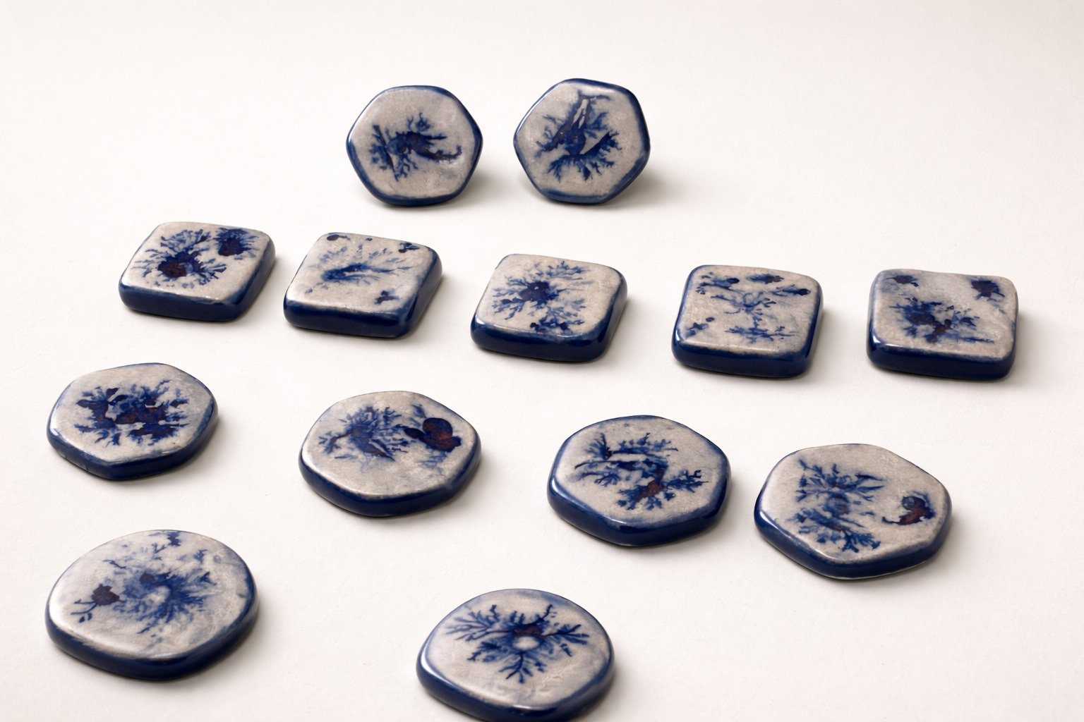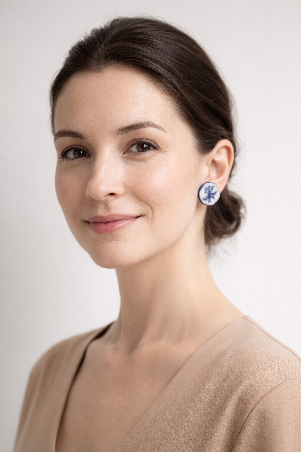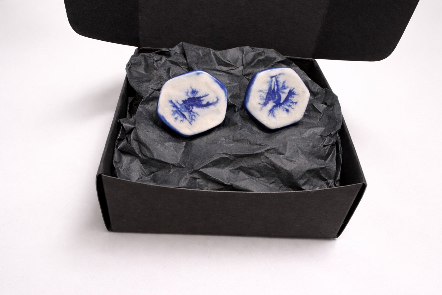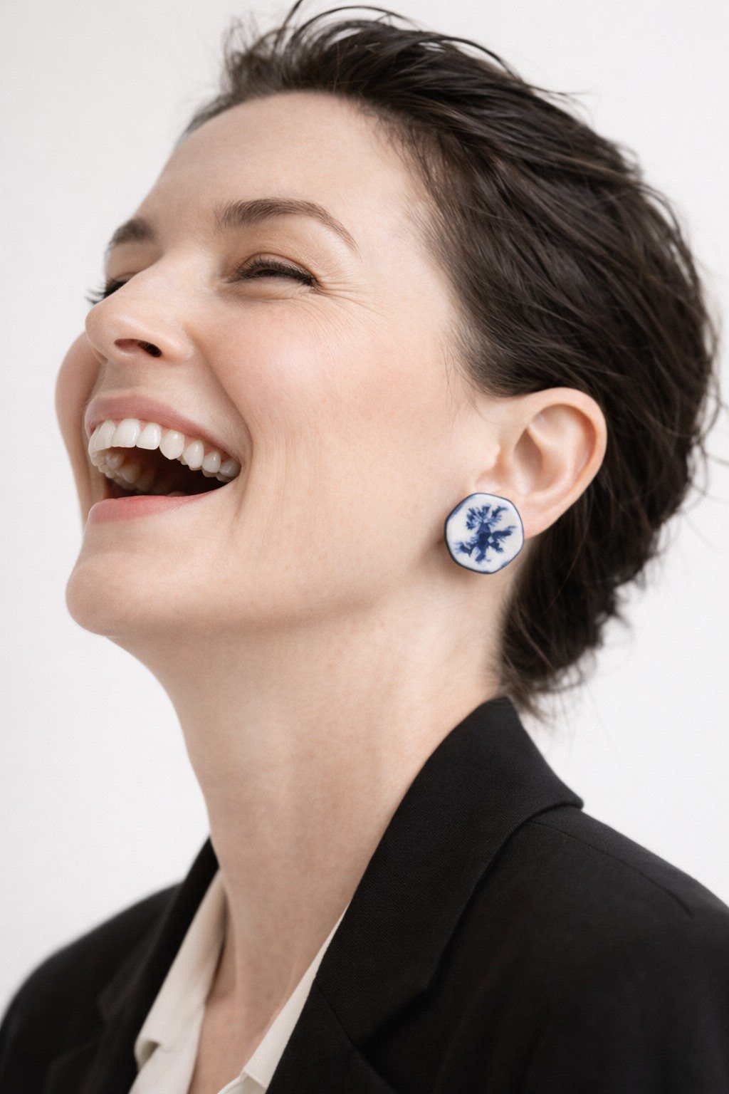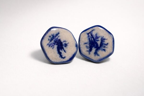 Envíos a España. Coste según destinoEstos pendientes hexagonales están hechos a mano en cerámica y cada pieza se convierte en un pequeño paisaje único. Sobre la base blanca, el pigmento azul cobalto se expande de forma orgánica, creando dibujos irrepetibles que recuerdan a algas marinas, manchas de tinta o formas minerales.