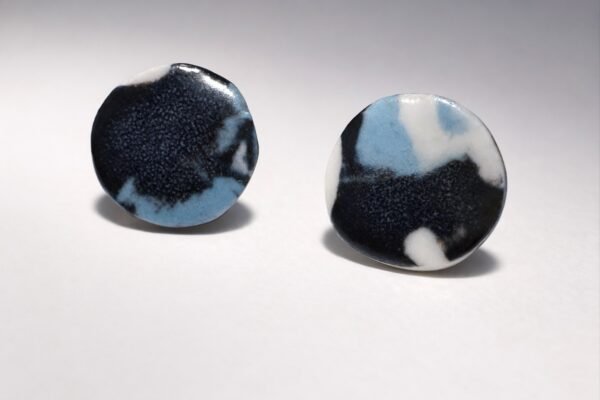 Pendientes elaborados íntegramente en porcelana, donde masas de distintos colores se encuentran y se mezclan de forma orgánica. El contraste entre el negro profundo, el blanco suave y el azul empolvado crea un patrón fluido, casi pictórico, que surge de la propia materia.