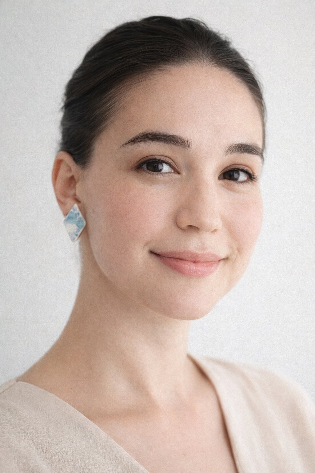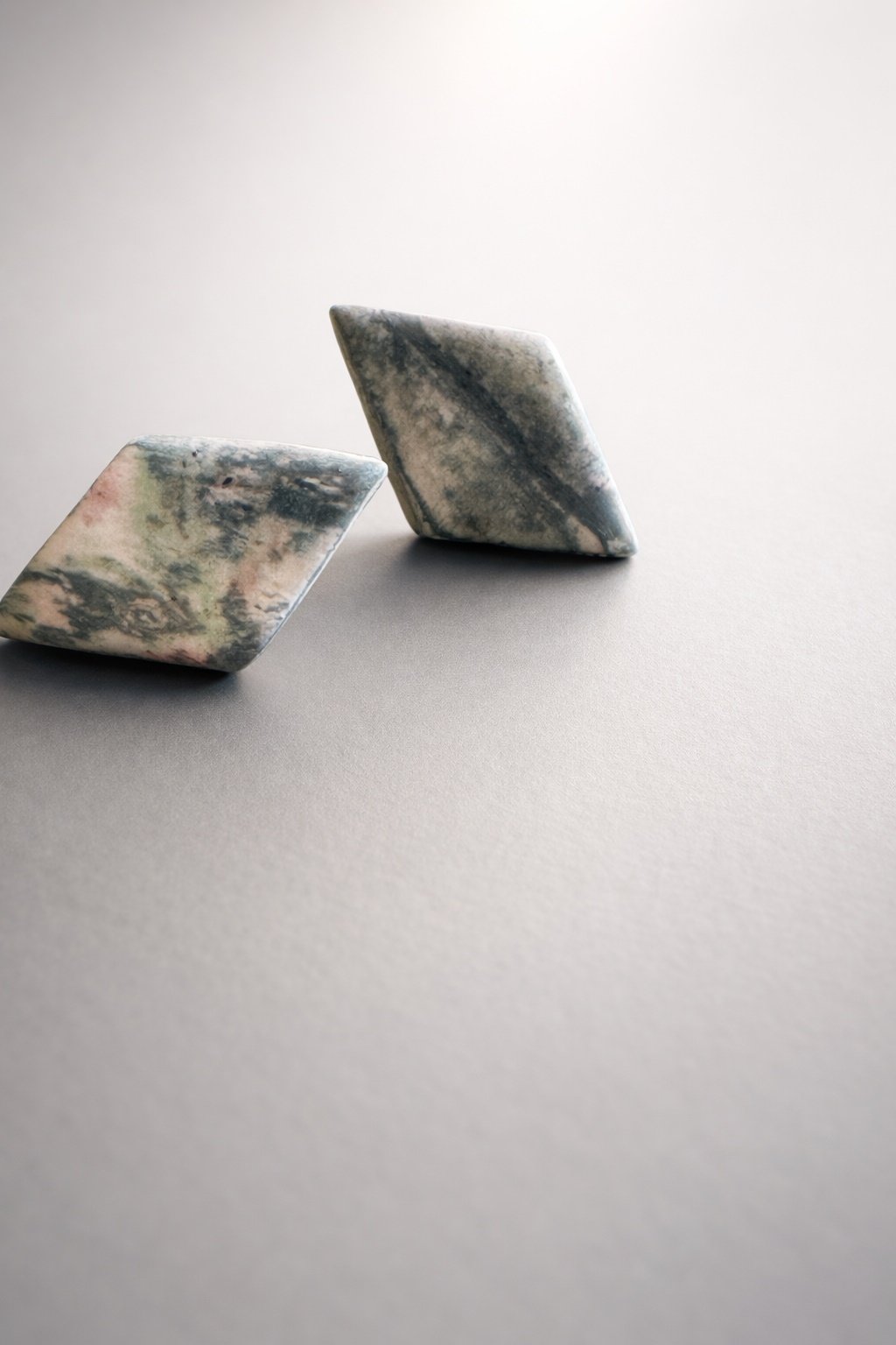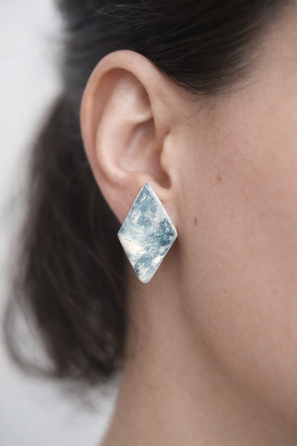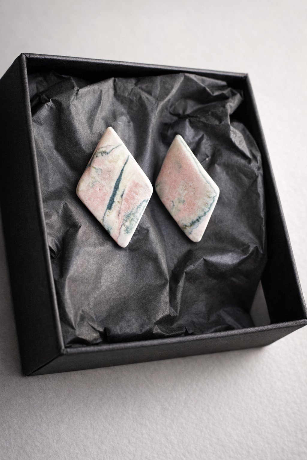 La geometría se suaviza en estos pendientes de porcelana de forma romboidal, donde la precisión del diseño se encuentra con la riqueza expresiva de la materia.