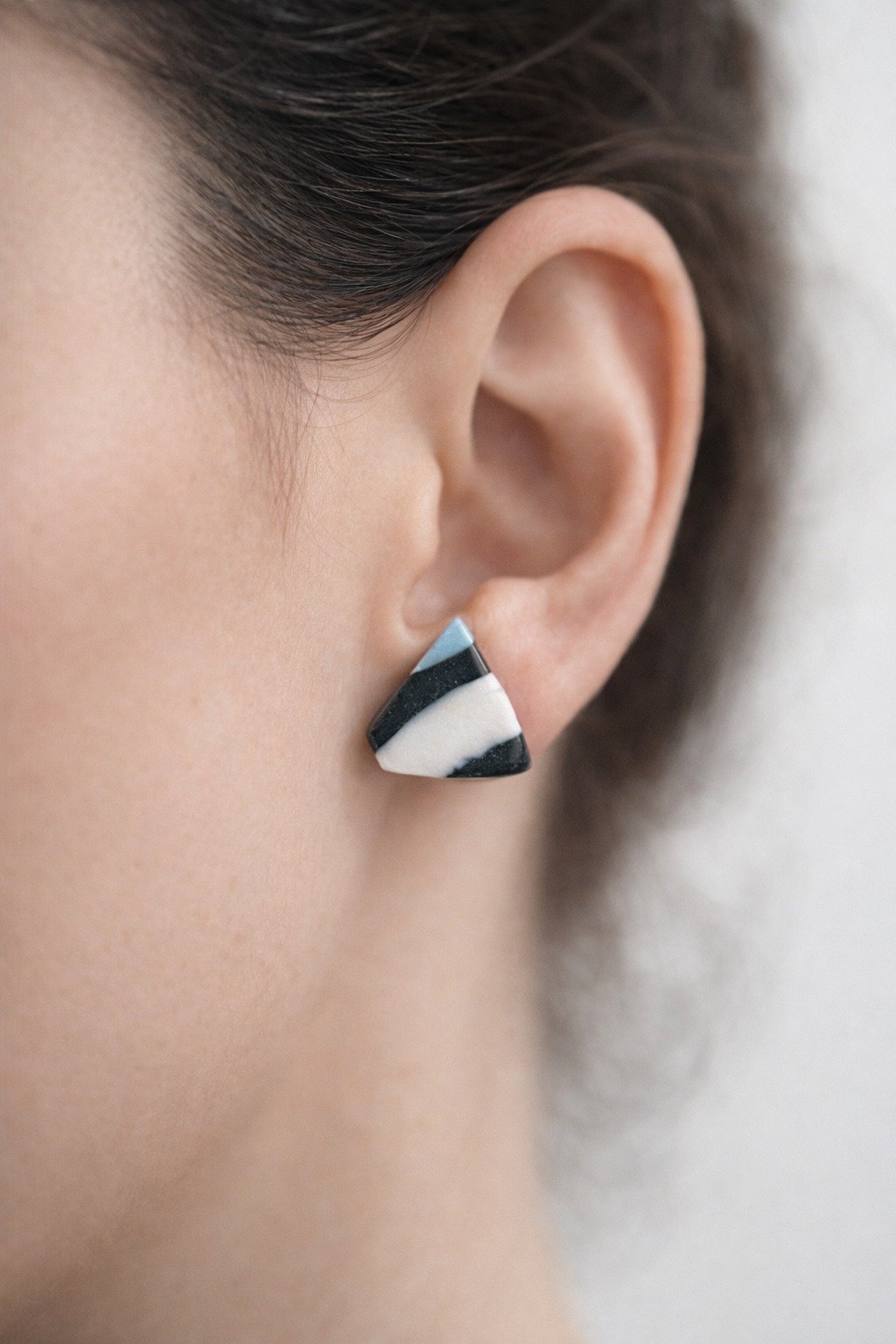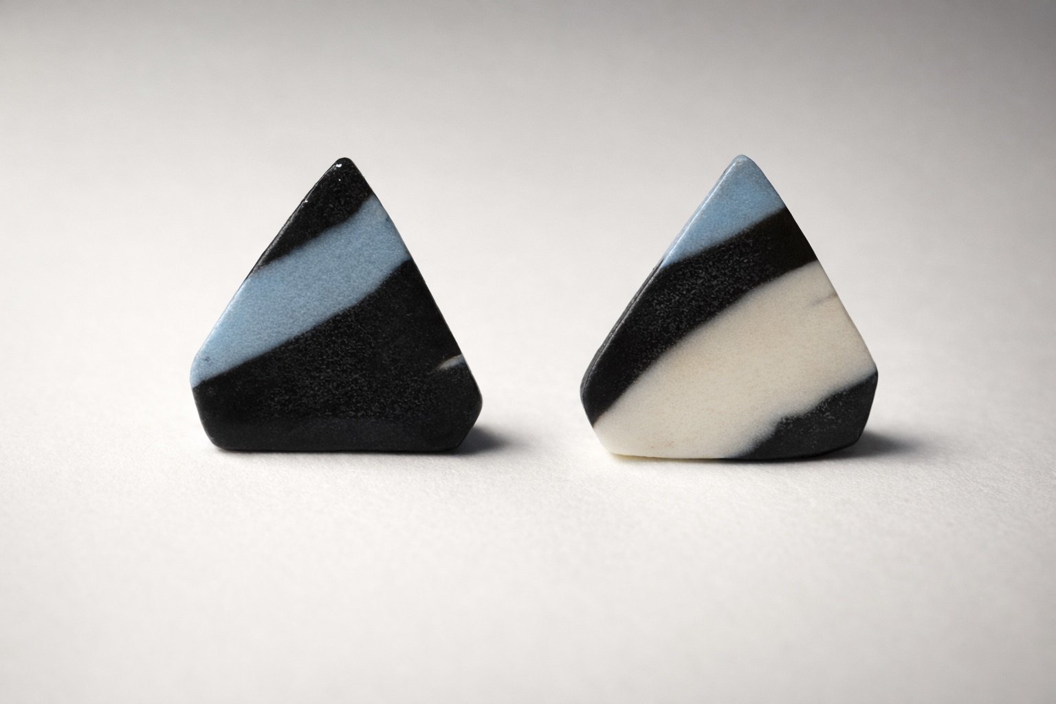 Pendientes de porcelana con una estética gráfica y contemporánea. Las transiciones orgánicas entre negro profundo, blanco marfil y azul suave crean un juego visual que recuerda a paisajes abstractos, donde el color fluye de forma natural e irrepetible.