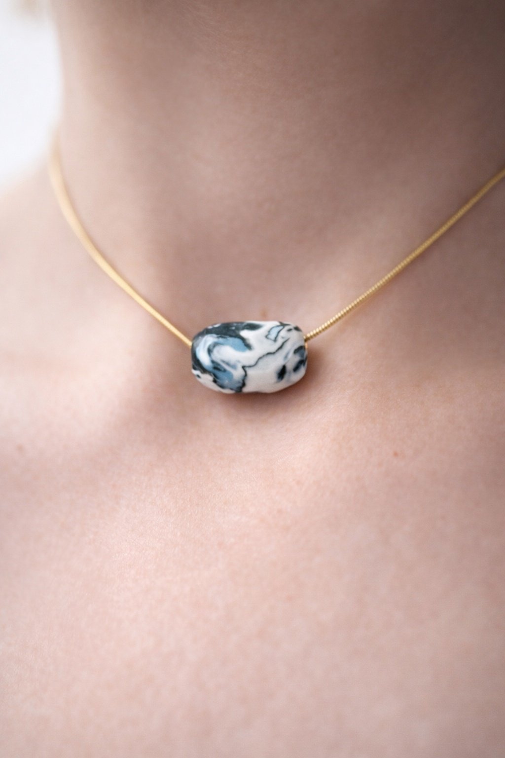 Collar de porcelana de líneas suaves y presencia sutil. La pieza central, de forma orgánica y pulida, combina porcelanas de distintos colores que se entrelazan creando un dibujo fluido, casi pictórico.