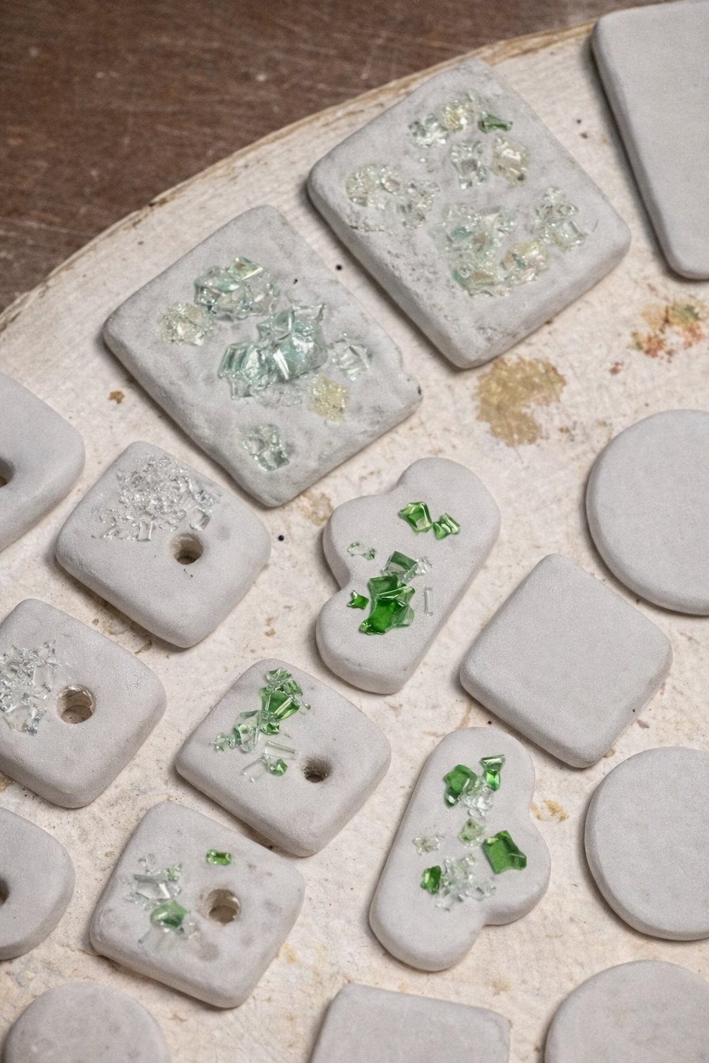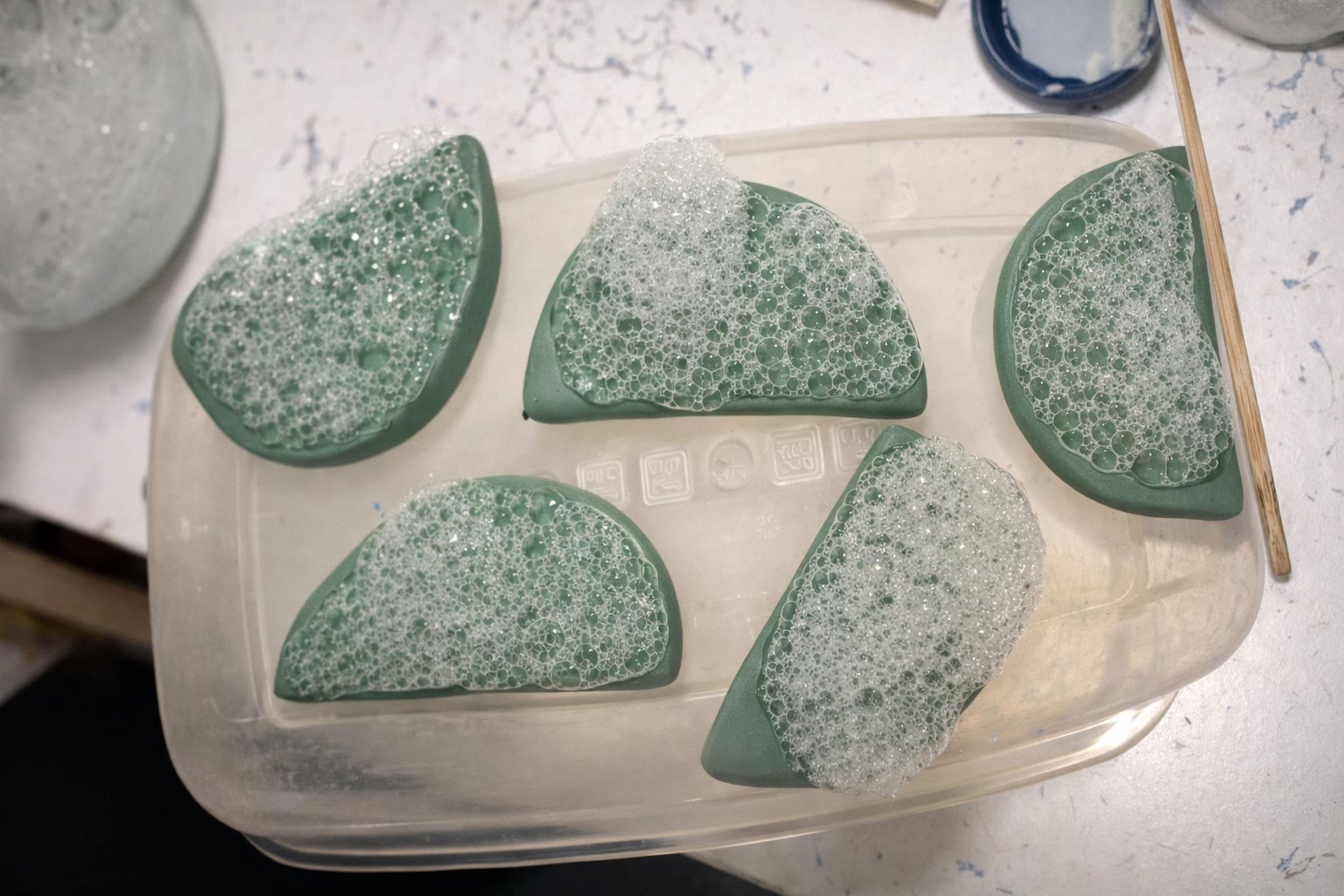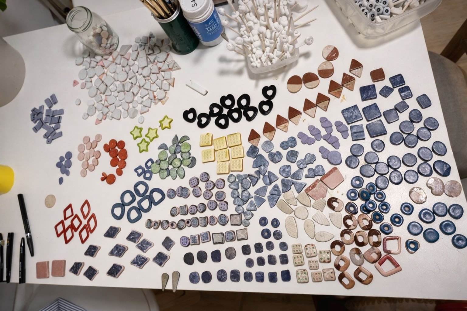 Nuestros días transcurren entre barro, la porcelana y herramientas. Entre pruebas, texturas, esmaltes y decisiones pequeñas que dan forma a cada joya. Modelamos, dejamos reposar, observamos cómo el material responde. Corregimos, esmaltamos, cocemos y esperamos con ansias ver el resultado.